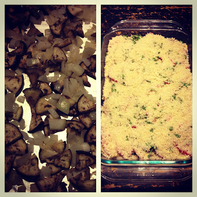quick rundown. fill the bottom of the pan with uncooked israeli couscous, roast egg plant and onions with a little olive oil and seasoning then layer on top of the couscous. then layer any vegetables you like. i used italian zucchini, a layer of mozzarella and tomatoes. then mix together some panko (or your choice of breadcrumbs), some parmesan, some chopped basil and chopped garlic. sprinkle over the dish and bake at 350 covered for about 30-45 minutes, then uncover and let the top get crispy and delicious. finally, greedily hope your family doesn't eat all of it, because the leftovers are fantastic as well. and lunch the next day has been made.